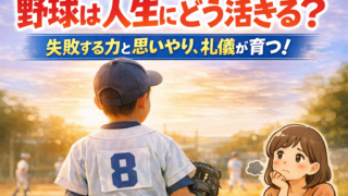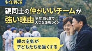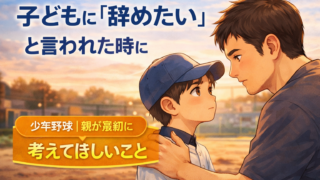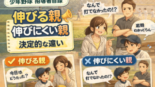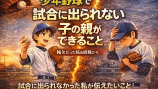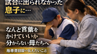 TOP カテゴリー 🔴 プロ・名指導者から学ぶ 🔵保護者のマインドセット 🟡 子どもへの関わり方 🟢 子どものサポート方法・練習方法 🟣 悩んでいるあなたへ X 2026.01.152026.02.08 学年別|少年野球に必要な野球用品リスト ▶ 幼稚園(はじめての野球)▶ 低学年(1〜2年生)▶ 中学年(3〜4年生)▶ 高学年(5〜6年生) おすすめ まずはこちらからどうぞ。👇 【少年野球の母は偉大だ!】指導者目線でお母さんたちに伝えたいこと。 2026.01.082026.02.02 試合に出られなかった息子に、何と言葉をかけていいか分からない母たちへ|指導者目線で伝えたいこと 2026.01.102026.01.23 【指導者の本音】少年野球ママが知っておきたい指導者との関わり方 2026.01.092026.01.23 悩んでいるあなたへ 少年野球を辞めたいと言われた時に読む話 2026.02.11 少年野球を辞めさせた方がいいのか迷った時に読む話 2026.02.11 少年野球って総額いくらかかる? 2026.02.08 悩み一覧へ 子どもへの関わり方 子どもへの期待、ちゃんと伝えられていますか? 2026.02.01 親同士の仲がいいチームが強い本当の理由 2026.01.27 指導者から見てわかる「伸びる子の親」と「伸びにくい子の親」の決定的な違い 2026.01.23 関わり方一覧へ マインドセット 子どもを支えるときに感じる不安や悩みに寄り添い、声のかけ方や関わり方を一緒に考えていきます。 野球は人生にどう活きるんでしょうか 2026.02.18 少年野球で試合に出られない子の親ができること 2026.02.18 大事な試合前の親の送り出し方 2026.01.27 マインドセット記事一覧へ サポート・練習法 このカテゴリーでは、子どもの成長につながる「おすすめ練習メニュー」やサポート方法を紹介しています。 バットに当たらない…自信が持てない子へ 2026.02.19 【完全版】少年野球バット徹底比較 ICON・レガシー・ワニクラッシャーの違い 2026.02.04 少年野球の寒さ対策|おすすめ防寒アイテム3選 2026.02.02 練習やサポートに関する記事一覧へ プロ・名指導者から学ぶ このカテゴリーでは、プロ野球選手やチームの考え方や通して、名指導者の言葉を伝えていきます。 侍ジャパンが世界一になれた本当の理由|指導者目線で教える「勝てる組織」と「伸びるこども」の共通点 2026.01.30 多賀少年野球クラブ辻監督から学ぶ指導方法 2026.01.29 ジャイアンツ・浅野翔吾から学ぶ練習方法 2026.01.29 記事一覧へ